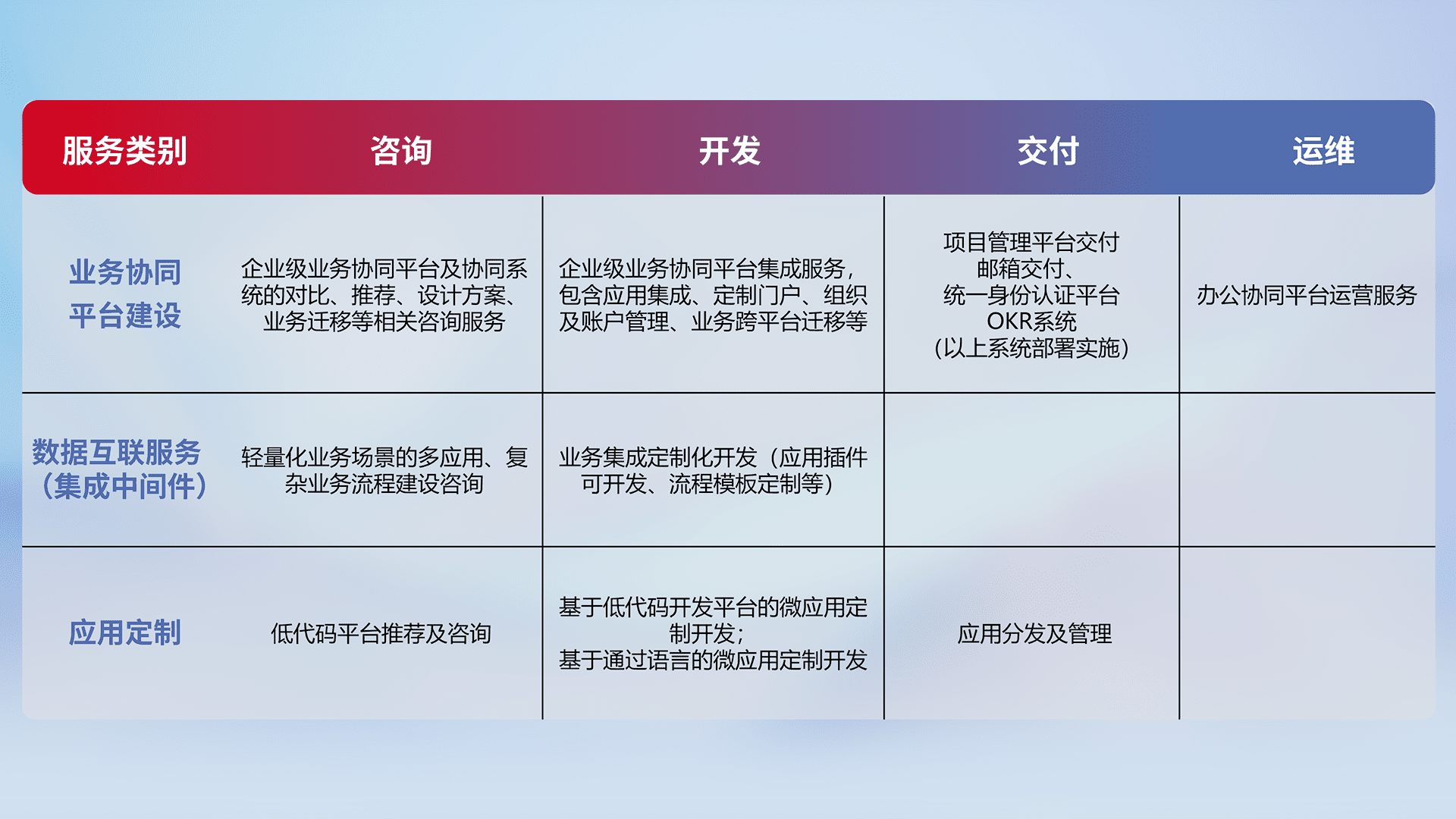 针对钉钉、、、、企微、、、、IDaas等平台级产品提供产品的规划、、方案、、、、交付、、定制化开发等服务,,,,实现如统一协同办公、、、、智能客户服务、、、混合会议管理、、智能数据查询、、等业务场景,,,,实现数字化转型。。。。